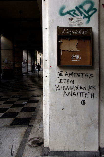 Bâtiment moderne avec passants devant des colonnes verticales