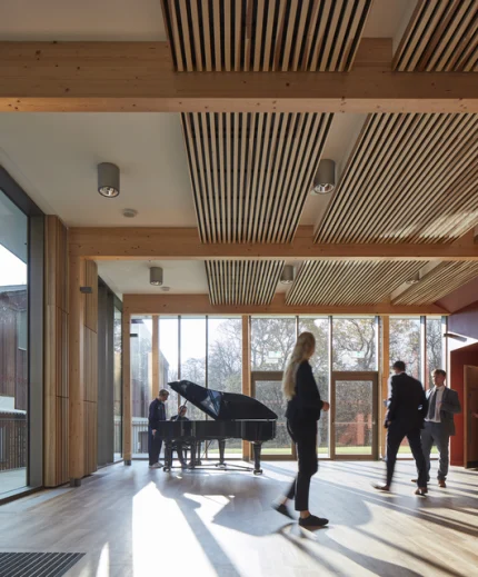 Gens dans une salle moderne avec piano à queue