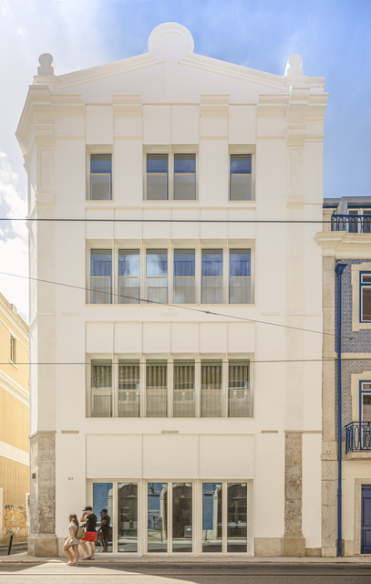 Façade d’immeuble blanc dans une rue avec piétons