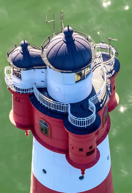 Pêcheur assis sur le quai à côté du phare rayé rouge et blanc