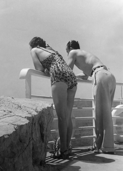 Couple en maillots de bain regardant la mer depuis un balcon