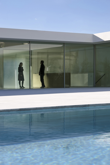 Conversation près d’une piscine moderne à travers une vitre