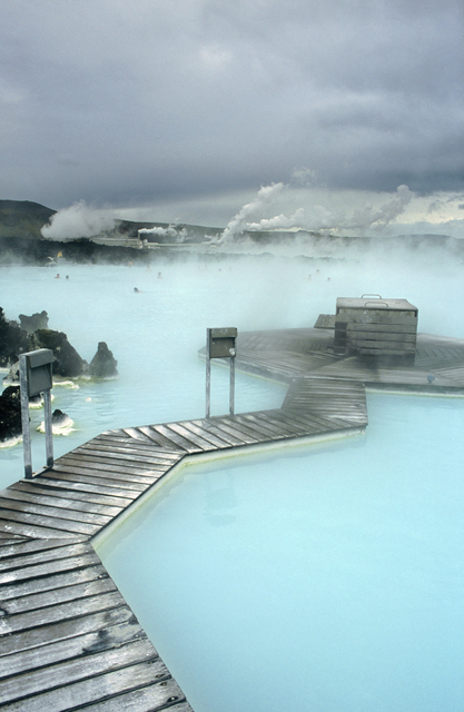 Bain thermal dans des sources chaudes avec une passerelle en bois