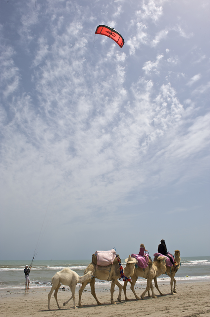 Promenade à dos de chameaux sur une plage avec cerf-volant