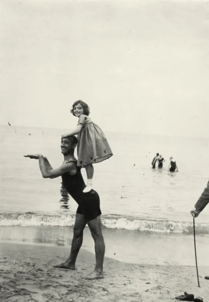 Homme portant une fillette sur le dos à la plage