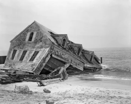 Maison effondrée sur une plage.