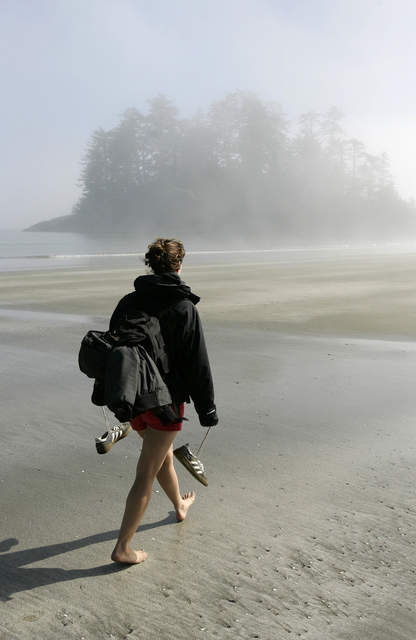 Personne marche sur une plage brumeuse