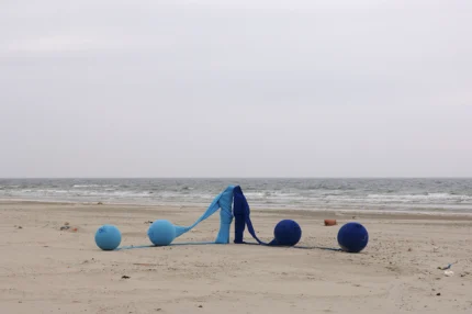 Installation artistique sur la plage avec des ballons bleus