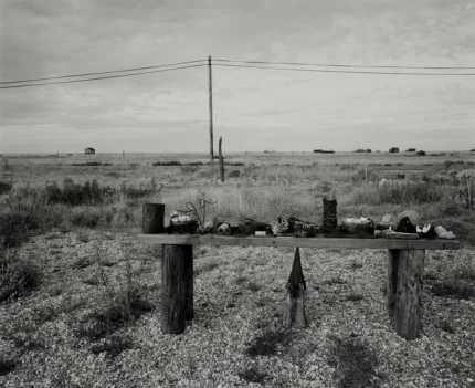 Table en bois avec objets divers dans un paysage rural