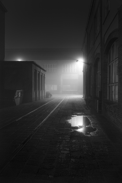 Ruelle Industrielle Nocturne avec Brouillard et Lumière de Réverbère