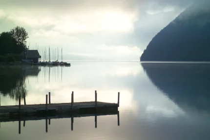 Lever de soleil sur un lac paisible avec bateau et quai.