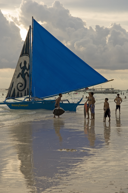 Voilier bleu sur la plage au coucher du soleil