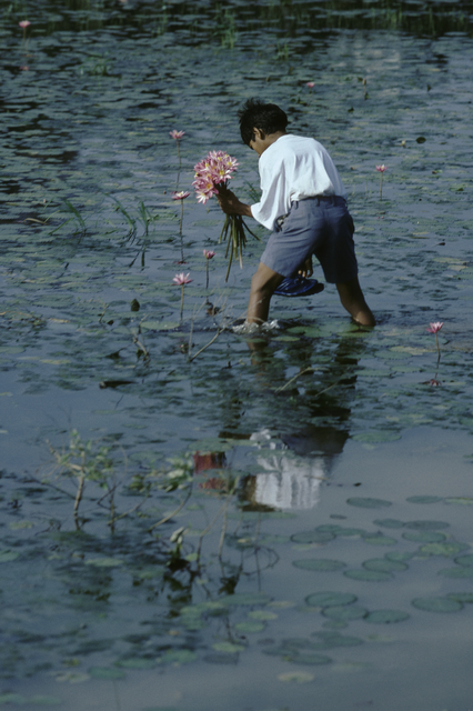 Enfant récoltant des fleurs de nénuphar dans un étang