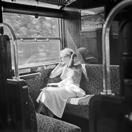 Femme assise dans un train en mouvement