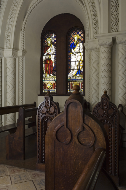 Vitrail coloré et bancs en bois dans une église