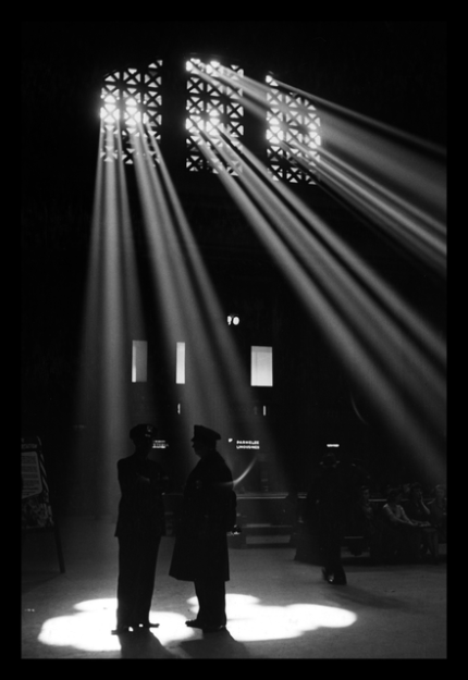 Deux policiers sous des faisceaux de lumière dans une gare