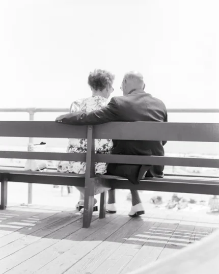 Couple âgé assis sur un banc, dos à la caméra