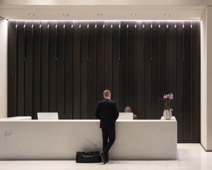 Hall d’entrée spacieux avec réception et jeu d’ombres.