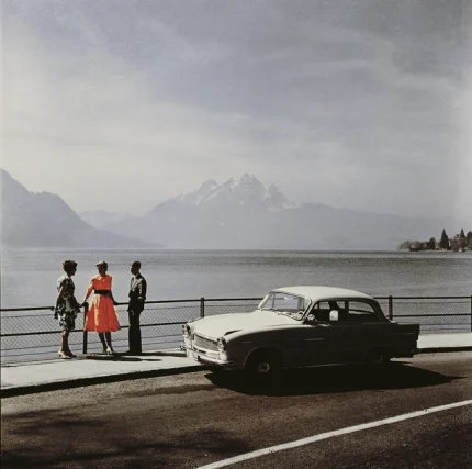 Trois adultes discutent près d’une voiture vintage au bord d’un lac