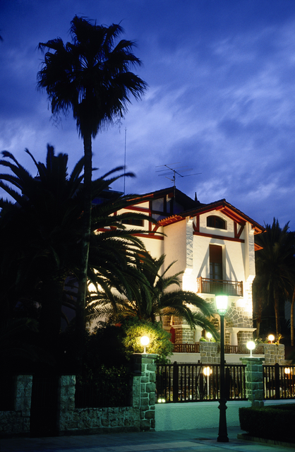 Maison de style espagnol avec palmiers au crépuscule