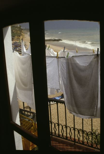 Linge séchant face à la plage par une fenêtre
