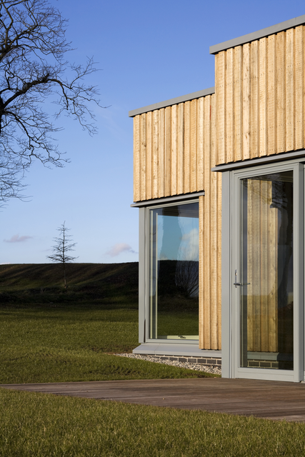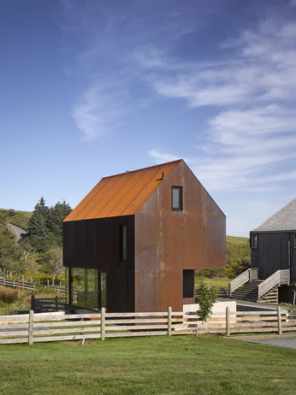 Maison moderne en bois avec toit rouillé dans un cadre rural