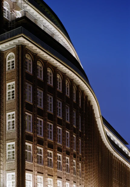 Immeuble au crépuscule avec architecture détaillée