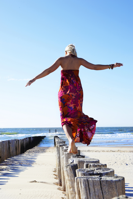 Femme marchant sur des poteaux en bord de mer