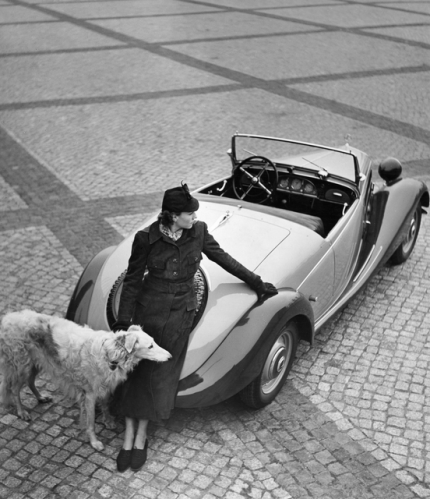 Femme et chien avec voiture classique sur une place pavée