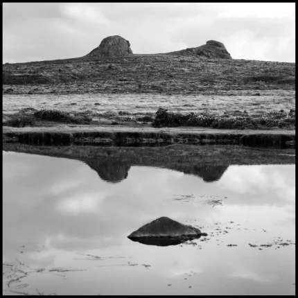 Reflection of Rocky Hills in a Tranquil Lake at Sunrise