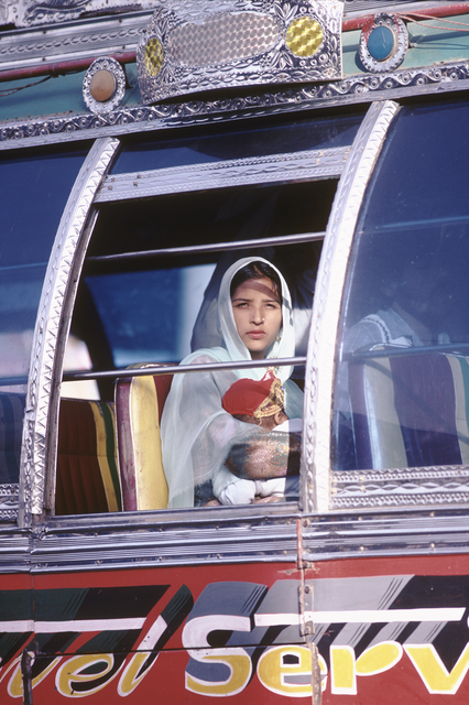 Mère et enfant regardant à travers la fenêtre d’un bus décoré
