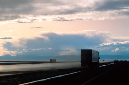 Paysage routier au coucher du soleil avec camions et voitures