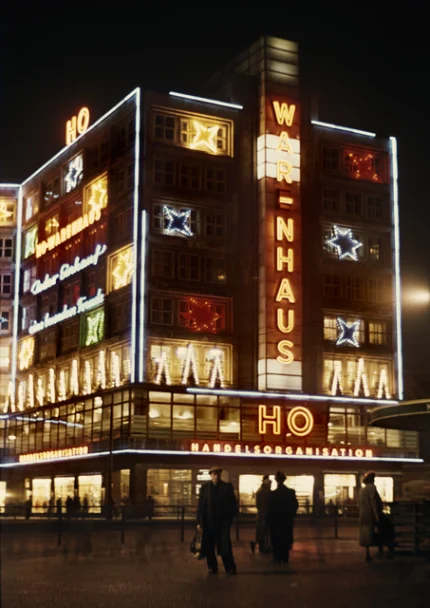 Bâtiment illuminé la nuit avec des enseignes lumineuses HO et WAR-ENHAUS