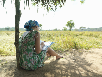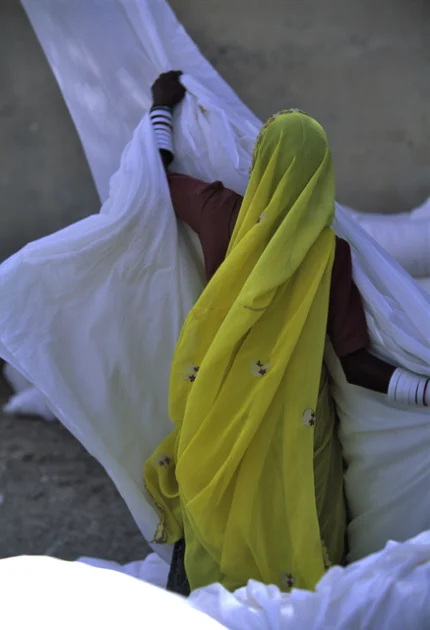 Femme marchant sur une route brumeuse avec un sac sur la tête