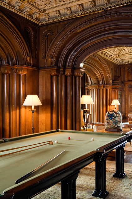 Salle de billard luxueuse avec boiseries et lampes élégantes