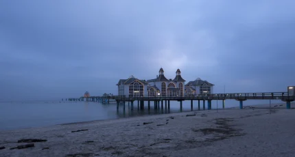 Ponton sur la plage à l’aube avec bâtiments éclairés