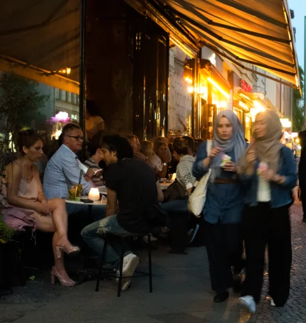 Soirée en ville avec piétons et cyclistes