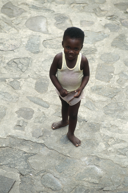 Enfant souriant debout sur un sol pavé
