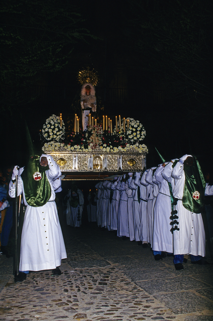 Procession religieuse de nuit avec statues et porteurs en vêtements traditionnels