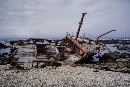 Cours de bâtiment dégradé avec des motos et filets de pêche