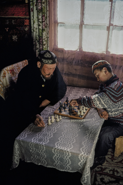 Partie d’échecs entre générations dans un intérieur traditionnel