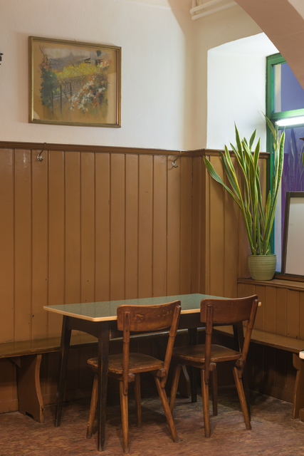 Chambre Vintage avec Papier Peint Vert et Meubles en Bois