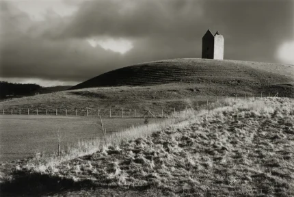 Maison solitaire sur une colline sous un ciel nuageux en noir et blanc