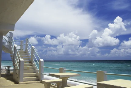 Escalier menant à une plage sous un ciel partiellement nuageux