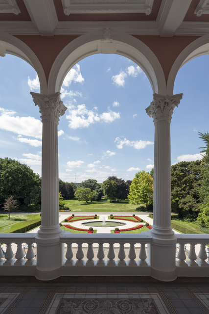 Jardin vu à travers des colonnes classiques sous ciel bleu