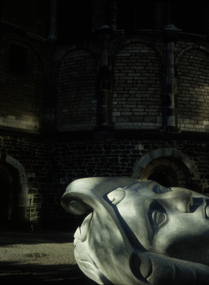 Tête sculptée en pierre devant un bâtiment en briques