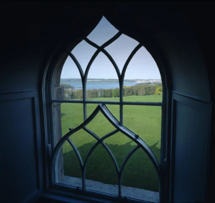 Fenêtre Gothique avec Vue sur la Campagne et un Lac