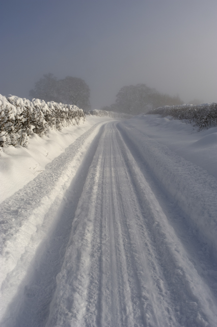 Chemin enneigé bordé de haies en hiver