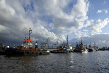 Bateaux amarrés dans un port industriel sous un ciel nuageux