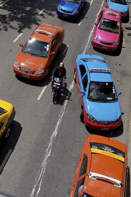 Circulation Routière avec Taxis Colorés et Motocycliste